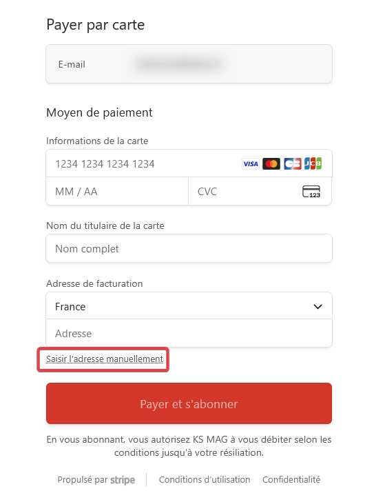 Il arrive parfois que le système de suggestion automatique ne reconnaisse pas l'intégralité de l'adresse. Dans ce cas, vous pouvez cliquer sur « Saisir l'adresse manuellement » pour remplir les champs vous-même.