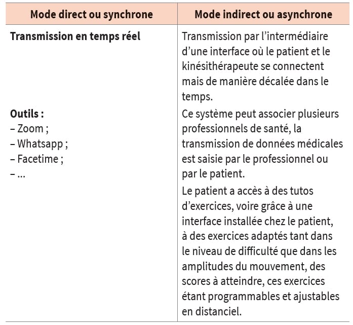 Il existe deux modes de télékinésithérapie : le mode synchrone ou « direct » et le mode asynchrone ou « indirect » (tab. I). Le modèle utilisé à ce jour correspond au mode synchrone. Il n’est pas exclu que les deux modes puissent être combinés dans l’avenir. Pour rappel, ces téléconsultations ont pris un essor majeur que ce soit pour les consultations d’anesthésie, les consultations médicales de suivi postopératoire, les consultations de généraliste, etc.